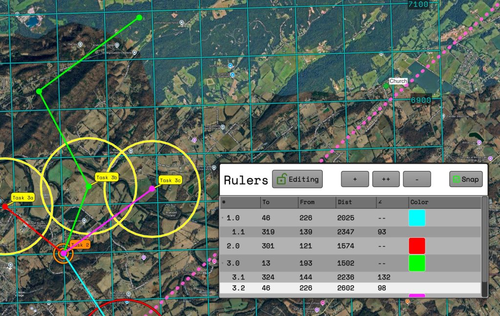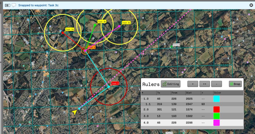 Once the ruler is added you can grab either end to reposition it. When the “snap” button is checked and releasing the point near a waypoint will “snap” the ruler point to match the coordinates of the waypoint. If the “snap” button is unchecked then the ruler point will stay wherever the cursor is released.