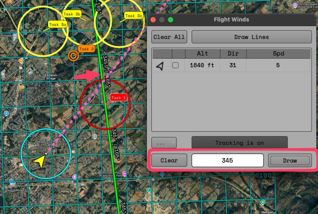 Useful when approaching a target and quickly placing winds provided by crew. Enter a value into the input field, click the “Draw” button, and then click on the map. This will draw the line at the location clicked. If you click near a waypoint the line will be centered over the waypoint.