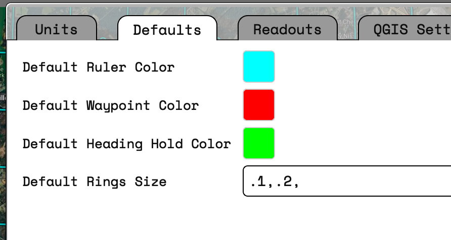 An additional tab for default values has been added. The colors will change the default used colors for the tool in the label, Ruler, Waypoints, Heading Hold. The default rings size will allow you to automatically add a set of rings to all new waypoints you create. These will still be removable or editable on waypoints during creation .